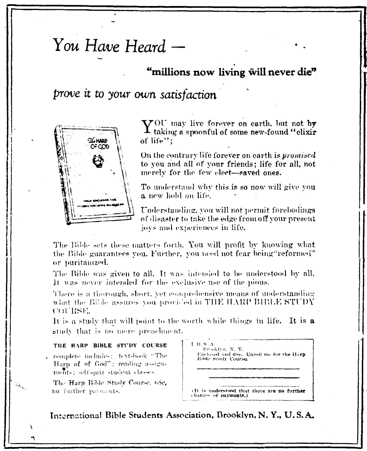 "The Message of the Hour. Millions Now Living Will Never Die! You may be one of them!"