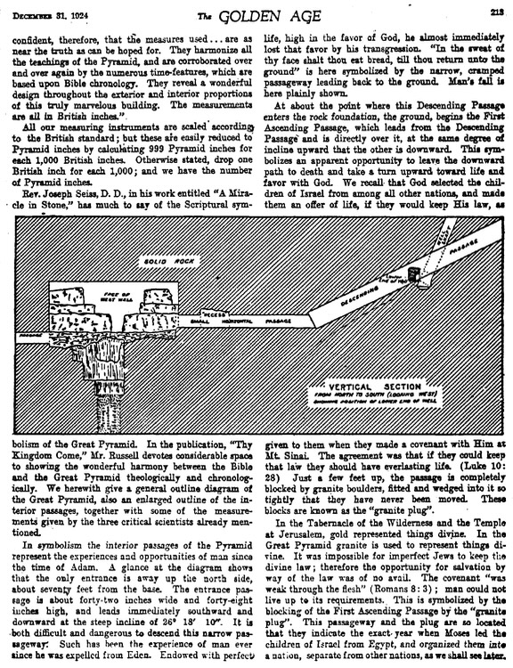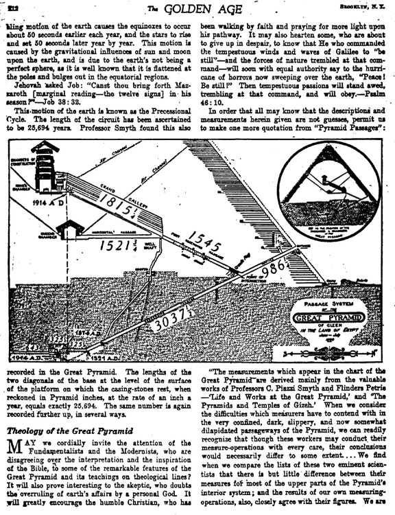 Even after 1919, Watchtower continued to promote pyramidology. In 1924 The Golden Age included the following discussion as proof of God's "overruling of earth's affairs".