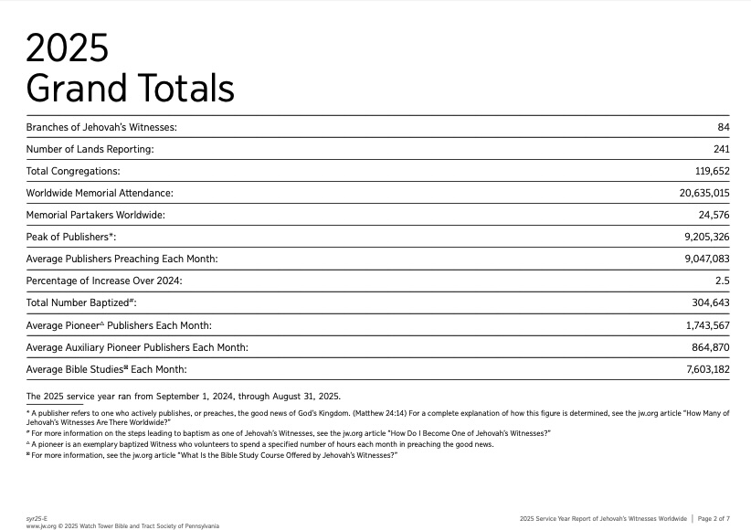2025 Jehovah's Witness Grand Totals