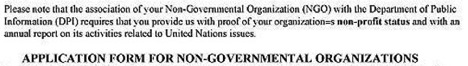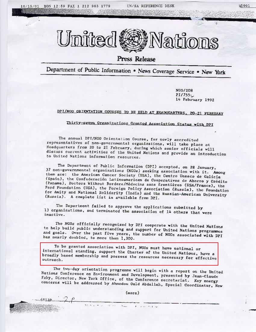 Más importantemente, no han habido cambios al requerimiento de las ONG's de estar de acuerdo en "apoyar" los ideales de las Naciones Unidas. Esto se muestra en una carta a alguien en el 2002 y también en un comunicado de prensa de 1992.