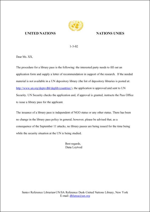 Los testigos que le escribían a las Naciones Unidas pidiendo clarificación en cuanto al acceso de la bibloteca han recibido respuestas tales como la carta siguiente. Esta carta explica que el estatus de ONG no es necesario para poder accesar la biblioteca.