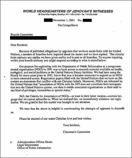 En una carta que se envió a las sucursales, se intentó justificar la membresía diciendo que el departamento de investigación de la Watchtower requería acceso a la biblioteca de las Naciones Unidas, diciendo que en 1991 se hizo necesario el registrarse como una ONG para continuar teniendo acceso. También se dijo que se salieron al saber que los requerimientos para seguir siendo una ONG habían cambiado. Una carta similar se le envió al periódico Guardian.