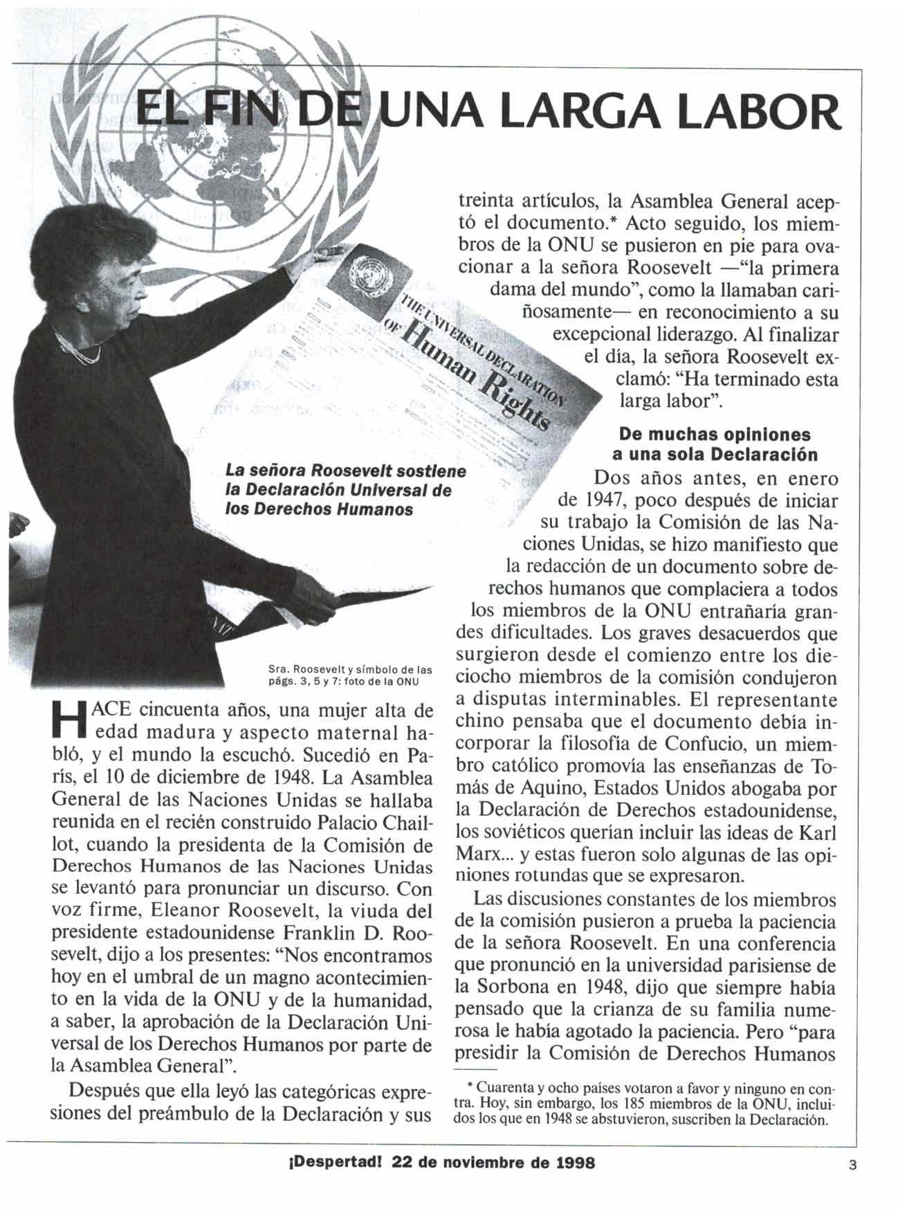 HACE cincuenta años, una mujer alta de edad madura y aspecto maternal habló, y el mundo la escuchó. Sucedió en París, el 10 de diciembre de 1948. La Asamblea General de las Naciones Unidas se hallaba reunida en el recién construido Palacio Chaillot, cuando la presidenta de la Comisión de Derechos Humanos de las Naciones Unidas se levantó para pronunciar un discurso. Con voz firme, Eleanor Roosevelt, la viuda del presidente estadounidense Franklin D. Roosevelt, dijo a los presentes: "Nos encontramos hoy en el umbral de un magno acontecimiento en la vida de la ONU y de la humanidad, a saber, la aprobación de la Declaración Universal de los Derechos Humanos por parte de la Asamblea General". ... Desde su adopción, la Declaración Universal se ha traducido a más de doscientos idiomas y ha llegado a formar parte de la Constitución de muchos países. Sin embargo, algunos líderes actuales creen que debe revisarse. Pero el secretario general de la ONU, Kofi Annan, no está de acuerdo. Según una funcionaria de la organización, este dijo: "Tal como no es necesario revisar la Biblia o el Corán, tampoco lo es modificar la Declaración. Lo que precisa una modificación no es el texto de la Declaración Universal, sino la conducta de sus seguidores". Despertad! 22 de noviembre de 1998 pp.3, 5