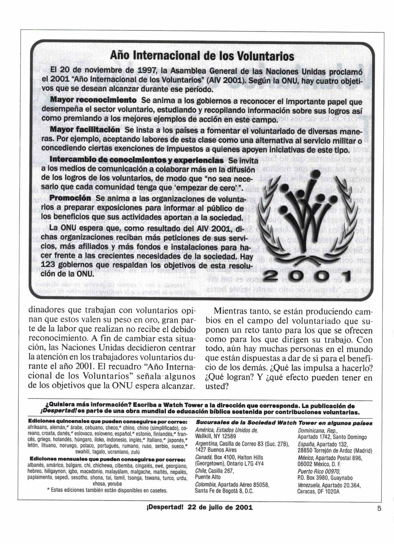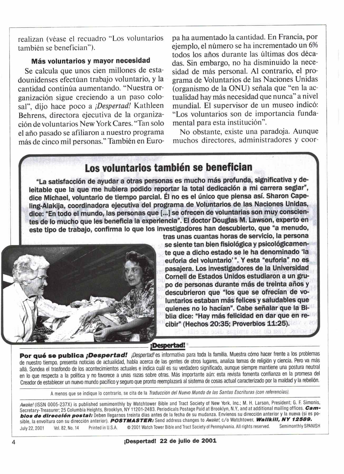 La Despertad! del 8 de diciembre del 2000 dedicó un número de páginas a discutir los excelentes esfuerzos de las Naciones Unidas y la Despertad! del 22 de julio del 2001 habló de los beneficios de ser voluntario de las Naciones Unidas, y mencionó su necesidad de más voluntarios.