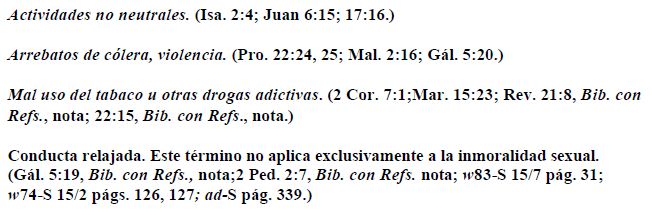 "Los testigos de Jehová mantienen neutralidad con relación a los asuntos políticos y militares de las naciones. (Juan 17:16; rs-S pags. 263-269.) ... Puesto que los cristianos dedicados verdaderos "no son parte del mundo", si un miembro de la congregación sigue un derrotero que viola su neutralidad cristiana y no muestra arrepentimiento por ello se habrá desasociado de la congregación cristiana, que es neutral. (Juan 15:19; 17:14-16; w82-S 1/3 pág. 31.)" "Presten atención a sí mismos y a todo el rebaño" p.140