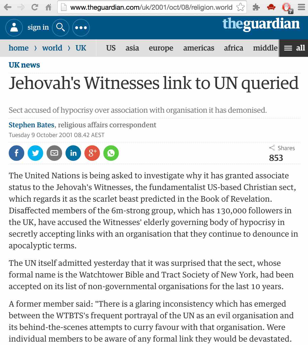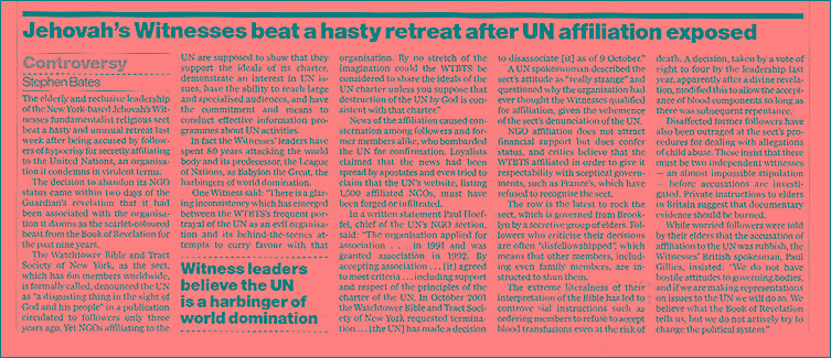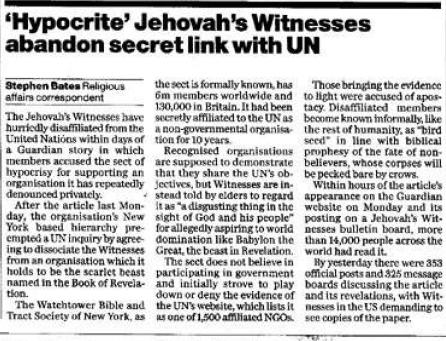 "Se le está pidiendo a la ONU que investigue por qué ha concedido estatus de miembro asociado a los Testigos de Jehová, una secta fundamentalista basada en los Estados Unidos, la cual la considera como la bestia de color escarlata predicha en el libro de Revelación. Los miembros disgustados del grupo de seis millones, 140,000 de los cuales están en el Reino Unido, han acusado de hipocresía al Cuerpo Gobernante, compuesto de ancianos, al aceptar secretamente enlaces con una organización la cual siguen denunciando en términos apocalípticos. Ayer la ONU misma admitió su sorpresa que la secta, cuyo nombre formal es La Sociedad Watchtower de Nueva York, ha sido aceptada en su lista de organizaciones no gubernamentales durante los últimos diez años."