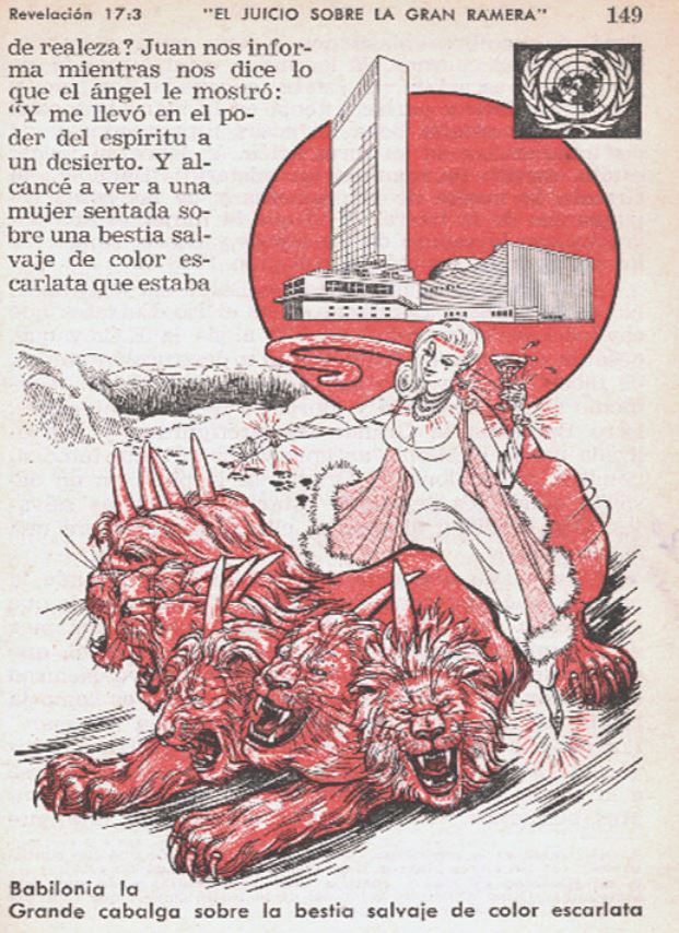 "Tales moradores de la Tierra se maravillaron con admiración ante la bestia salvaje escarlata revivificada. Se colocó mucha confianza en la habilidad de ella como poder para la paz y seguridad mundiales. Se esperaban grandes cosas de ella, y se le dieron designaciones que eran realmente blasfemas desde el punto de vista de la Santa Biblia. ¿Por qué? Porque se le atribuyeron a esta "bestia salvaje" poderes y tareas que realmente pertenecen al reino de Dios y su Mesías o su Cristo. Allá en el año 1919 se había hablado seriamente de la Sociedad de las Naciones escarlata como "la expresión política del Reino de Dios en la Tierra." Y ahora a las Naciones Unidas, sucesora de esa Sociedad, se le ha llamado el mejor medio para la paz, sí, aun más que eso, la "última esperanza para la paz. "De modo que ahora podemos ver en su realídad lo que el apóstol Juan vio en símbolo, que esa bestia salvaje de color escarlata está "llena de nombres blasfemos." Esas expresiones de admiración por ella dirigen a los relígiosos falsos, no a la adoración de Jehová Dios el Creador, sino a la idolatría de una creación hecha por el hombre, la adoración de una imagen política, la adoración de una organización internacional para la paz y seguridad mundiales. - Rev.17:3." Atalaya 15 de mayo de 1964 p.313