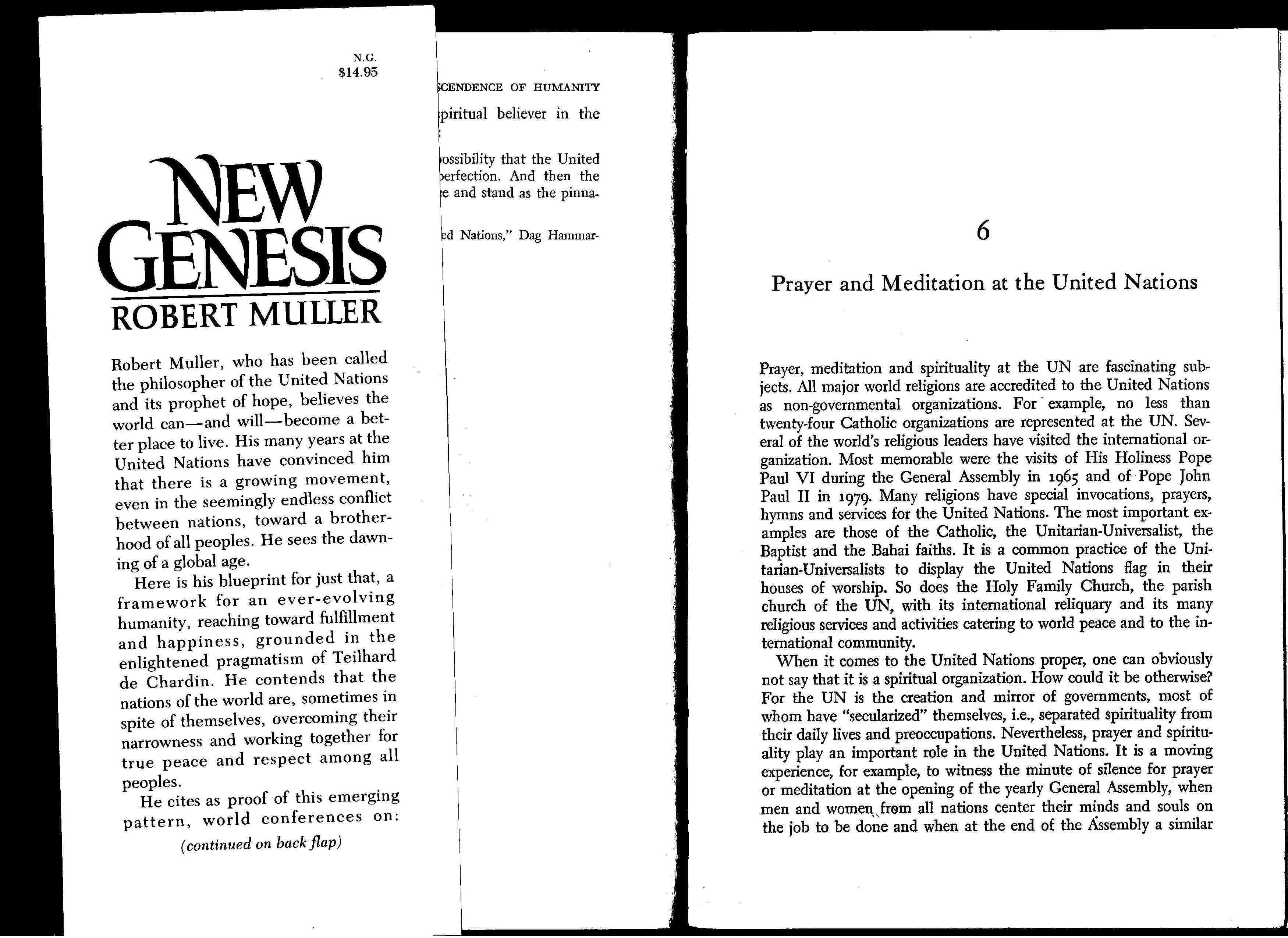 La cita parcial de arriba es de "New Genesis Shaping a Global Spirituality" por Robert Muller (1982) capitulo 6. La oración anterior decía: