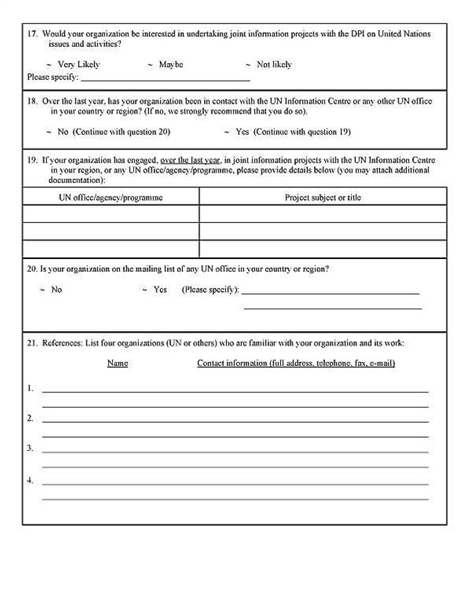 "El propósito principal de la afiliación de organizaciones no gubernamentales con el Departamento de Información Pública de las Naciones Unidas es la rediseminación de información para aumentar el conocimiento público de los principios, actividades y logros de las Naciones Unidas y sus entidades. Por consiguiente, es importante que usted nos mantenga informados acerca del programa de información de su organización en lo que se refiere las Naciones Unidas, el cual incluye en enviarnos números de sus publicaciones pertinentes. Se adjunta un folleto titulado "las Naciones Unidas y las Organizaciones no Gubernamentales", el cual le dará información acerca de la relación ONG."