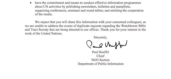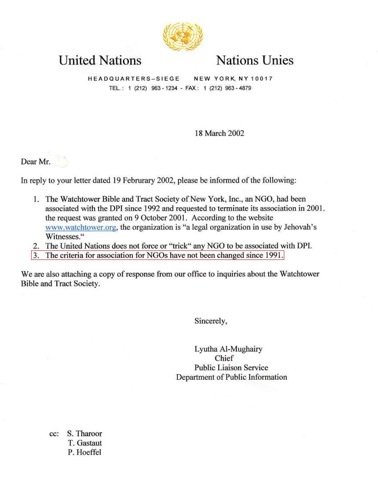 Debido a que muchos pidieron confirmación, la ONU publicó cartas verificando la asociación de la Watchtower (traducción al español abajo).