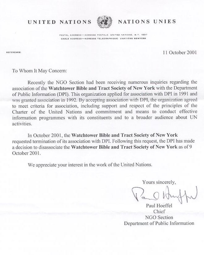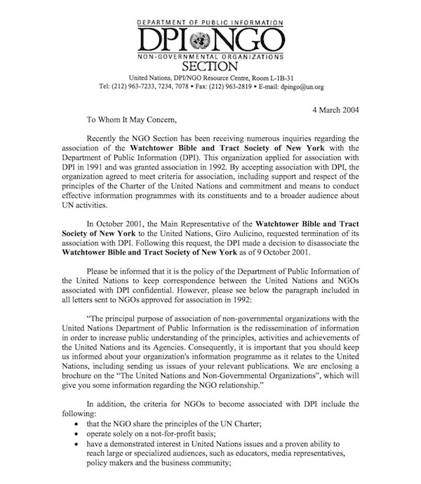 En 1992, La Watchtower Bible and Tract Society of New York (Sociedad Watchtower) se inscribió como Miembro Asociado y Organización no Gubernamental (ONG) del Departamento de Información Pública (UN DPI) de las Naciones Unidas. Esta es la más cercana relación que una ONG puede formar con la ONU. Esta aplicación fue renovada anualmente y las pruebas de esto están disponibles públicamente.