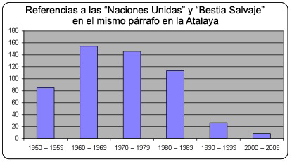 Incluso más notable es la reducción en el número de veces en que las Naciones Unidas se le llama la "bestia salvaje" en la Atalaya.