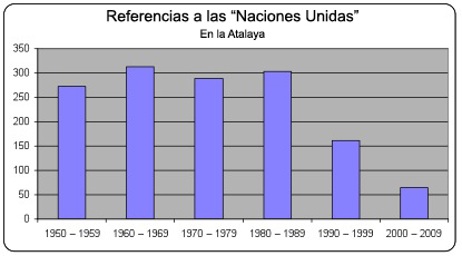 Entre 1990 y el 2010, ha habido una reducción significativa de referencias a las Naciones Unidas en la revista Atalaya.
