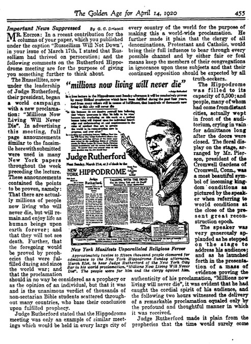 These statements are complete falsehoods. Rutherford's message was the very opposite of what these articles claim. He was not preaching that millions of Watchtower followers were never to die, in fact the few thousand Bible Students all expected to die and go to heaven, as either the Little Flock or Great Crowd. At that time, the teaching was that the Great Crowd would go to heaven. The "Millions" that Rutherford was referring to who would never die were the rest of humankind alive at that time.