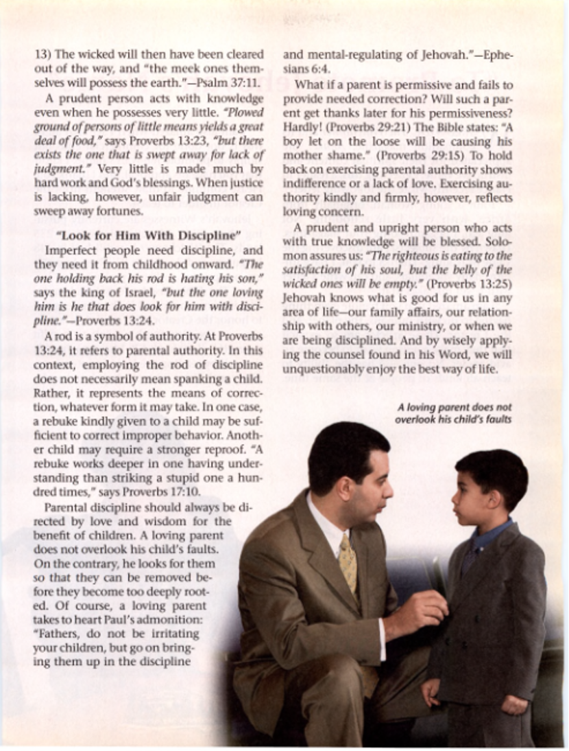 "A spanking may be a lifesaver to a child, for God’s Word says: “Do not hold back discipline from the mere boy. In case you beat him with the rod, he will not die. With the rod you yourself should beat him, that you may deliver his very soul from Sheol [the grave] itself.” Again, “Foolishness is tied up with the heart of a boy; the rod of discipline is what will remove it far from him.” (Proverbs 23:13, 14; 22:15) If parents hold their children’s life interests dear to them, they will not weakly or carelessly let disciplinary action slip from their hands. Love will motivate them to take action, wisely and fairly, when it is needed." Making Your Family Life Happy (1978) p.132