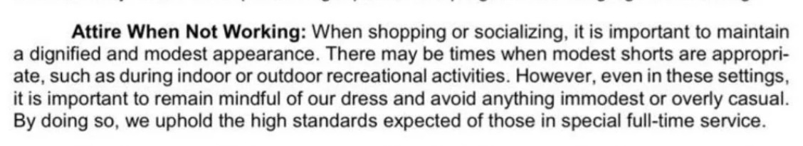 "Even as we check in and out of a hotel, as well as when we enjoy leisure time before and after convention sessions, we want to avoid an appearance that is overly casual or slovenly." Ibid p.19 par.8