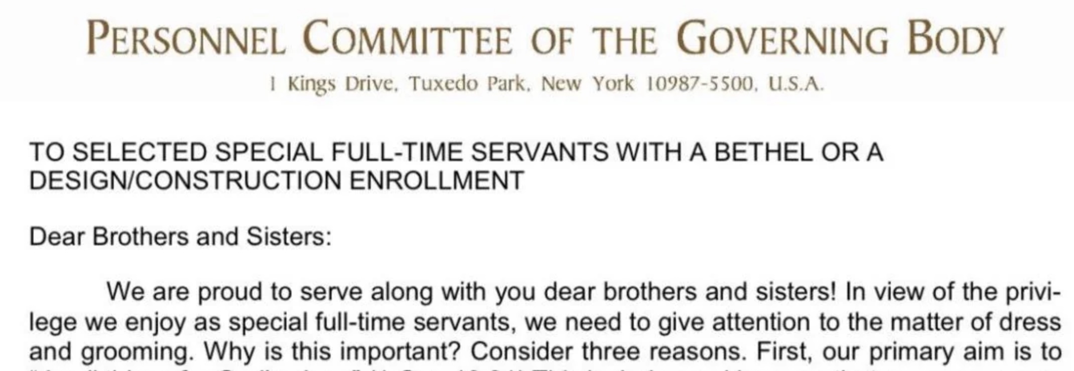 Those working at Bethel are provided strict rules. A 2025 letter to Bethelites forbids extremely short, masculine hair for sisters, no tight-fitting or "sensual" clothes and brothers' beards must be neatly trimmed.
