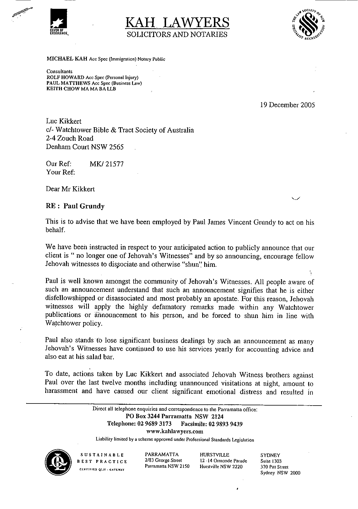 There was no explanation as to why the Watchtower was not covered by the Privacy Act so I rang Vincent Toole for an explanation. As he refused to divulge the reasoning, I advised him that I would refer the case to the Australian Privacy Commissioner. A representative for the Privacy Commissioner spoke to Vincent, who explained Watchtower is not covered because they do not have over $3 million turnover, one of the requirements to fall under the Act. Watchtower provided the Commissioner with a signed Statutory Declaration to that affect. On this basis, the Privacy Commissioner closed the case.