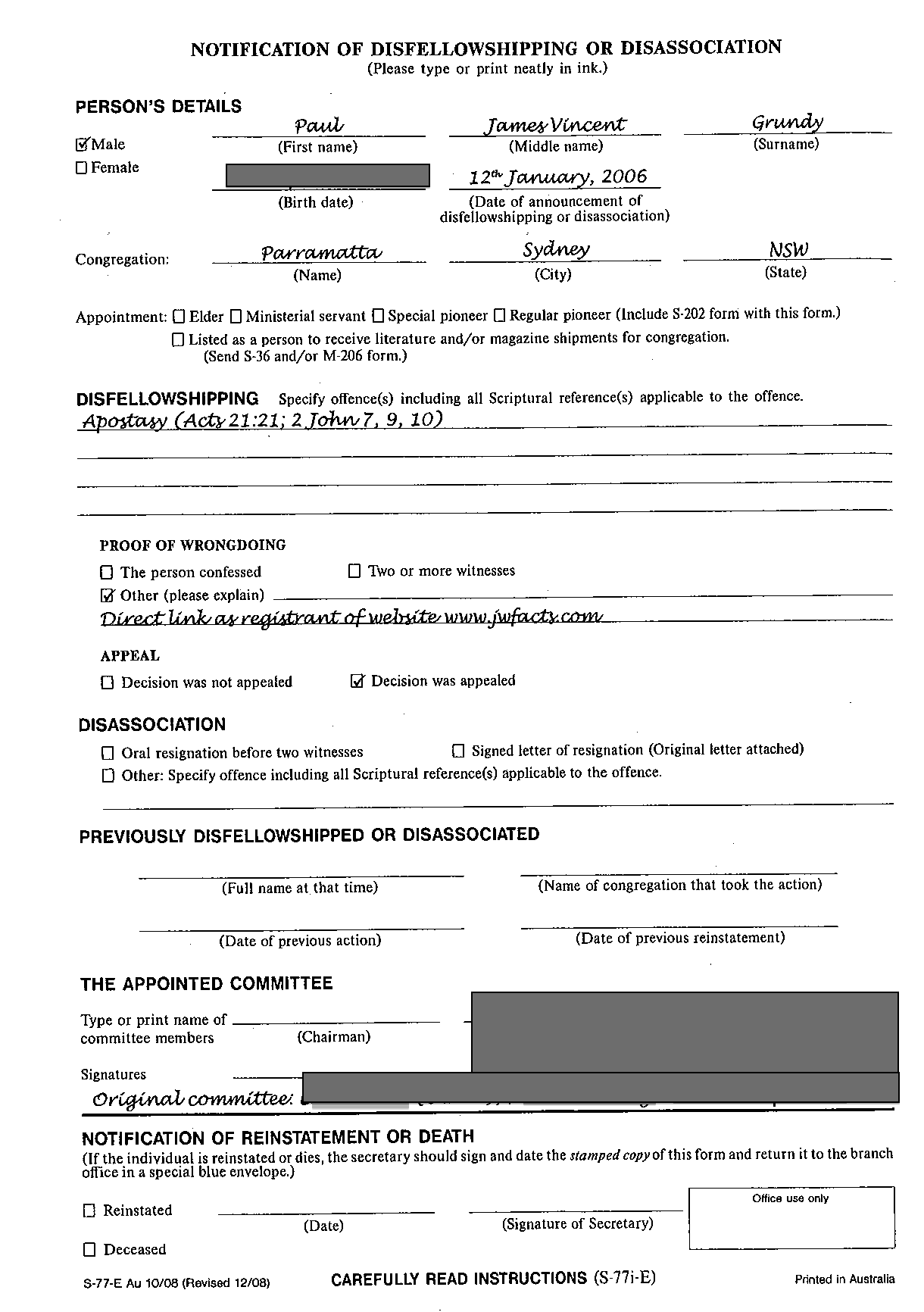 The files I received trace a path through my life as a Witness; applying to be a pioneer in 1987 at the age of 17, appointment as a Ministerial Servant at the age of 20, being assigned as a family to leave Hobart and move to Sydney at 21, going to bethel at 22 and finally being disfellowshipped at 36. For each of these events either the congregation or Bethel stores a form or letter.