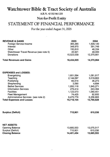 I was fairly certain the Australian branch of Watchtower turned over $3 million per year so purchased the 2005 financial report for the Watchtower Bible and Tract Society of Australia from ASIC (Australian Securities & Investments Commission). This showed annual turnover of $16 million. I conveyed this to the Privacy Commissioner, compelling them to reopen the case.
