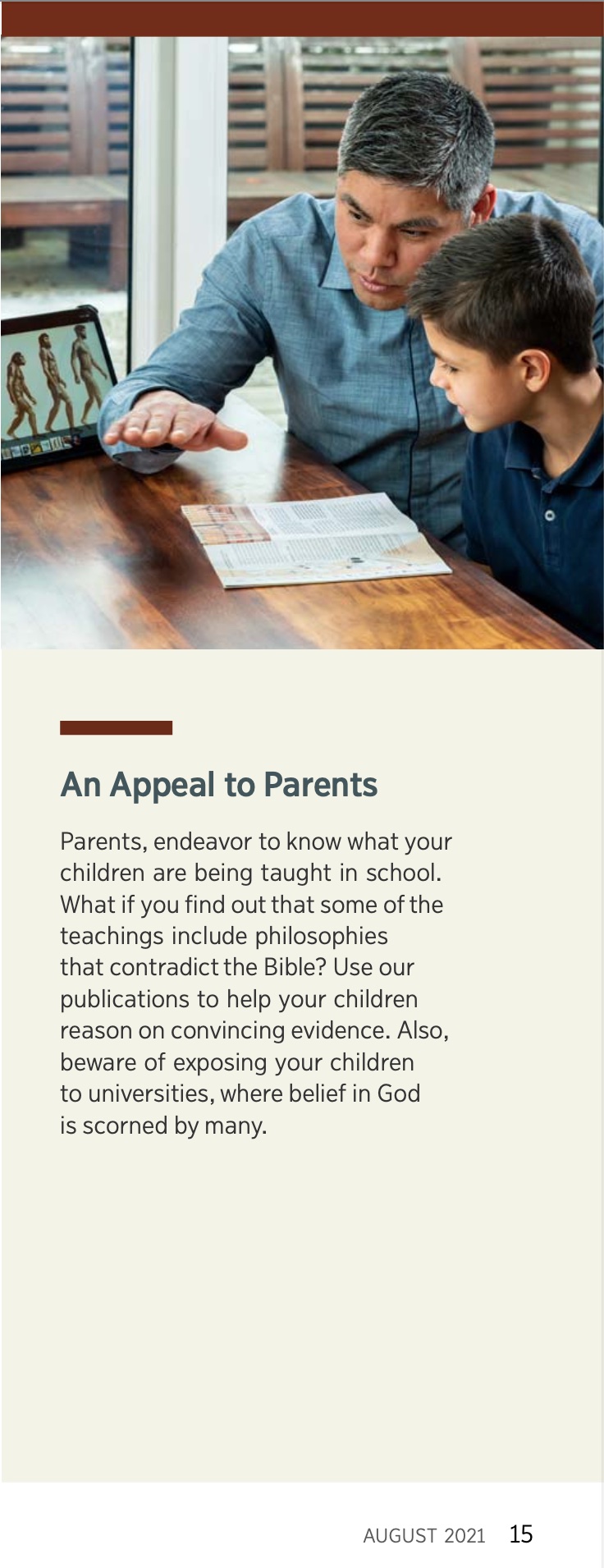 “Satan appeals to natural desires. We have a natural desire to learn skills that can help us provide for ourselves and our families. (1 Tim. 5:8) Often, we can gain those skills by attending school and being diligent students. But we must be cautious. The educational system in many countries teaches students not only practical skills but also human philosophy. Students are encouraged to question the existence of God and to disregard the Bible. They are told that the theory of evolution is the only intelligent explanation for the origin of life. (Rom. 1:21-23) Such teachings are opposed to “the wisdom of God.”—1 Cor. 1:19-21; 3:18-20.