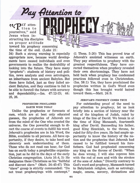 Missing was the full measure of evidence required in fulfillment of Bible prophecy. Missing from such people were God's truths and the evidence that he was guiding and using them." Awake! 1968 Oct 8 p.23