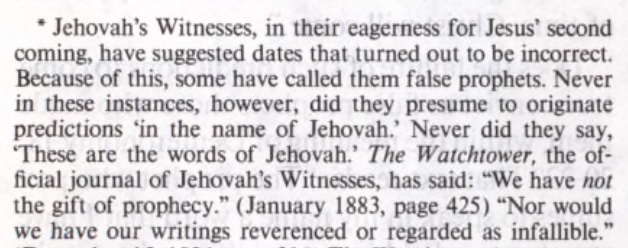 An Awake! article from 1993 is one of Watchtower's most ironic. The Mar 22 article, Why So Many False Alarms, mocks religious groups that falsely predicted dates for the "world's end", referring to them as "doomsday groups." The footnote on page 4 then claims that anyone calling Jehovah's Witnesses false prophets are wrong, because Watchtower predictions were never "'in the name of Jehovah.'" This is despite Jehovah's Witnesses being the preeminent doomsday group of the 21st century, and one of the few that refer to themselves as Jehovah's prophet.