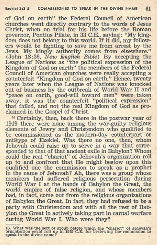 "More accurately, was there any group on whom Jehovah would be willing to bestow the commission to speak as a “prophet” in His name, as was done toward Ezekiel back there in 613 B.C.E.?" Watchtower 1972 Mar 15 p.189