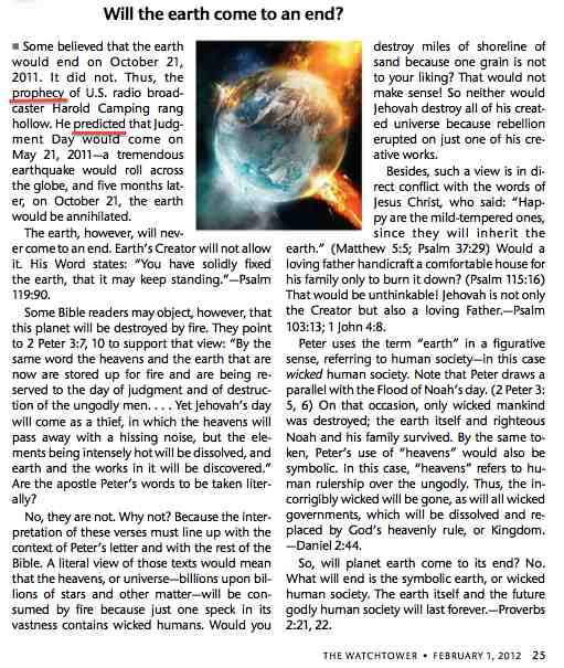 "Some believed that the earth would end on October 21, 2011. It did not. Thus, the prophecy of U.S. radio broadcaster Harold Camping rang hollow. He predicted that Judgement Day would come on May 21, 2011 …" Watchtower 2012 Feb 1 p.25