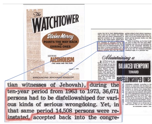 "36,671 persons had to be disfellowshiped for various kinds of serious wrongdoing. Yet, in that same period 14,508 persons were reinstated." Watchtower 1974 Aug 1 p. 466