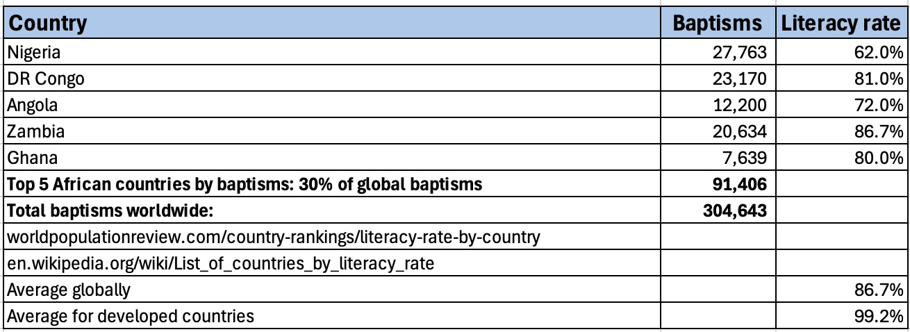 In 2025, 45% of global baptisms were in Africa, with 30% in just 5 countries. Each of these countries have with literacy rates below the global average of 86.7% and well below the 99.2% average of developed countries.